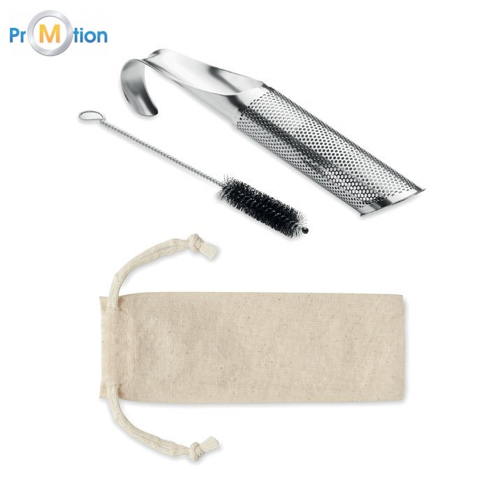 Opětovně použitelná sada čajového louhovače z nerezavějící oceli v bavlněném sáčku. Obsahuje čajový filtr s kompaktním a zakřiveným hákem, který umožňuje viset přes okraj šálku nebo hrníčku a kartáček na čištění.