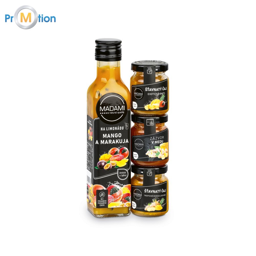 Exotická dárková sada, obsahuje ovocný koncentrát Mango a marakuju (250 ml), Zázvor v medu (68 g), Citrusovou směs (55 ml) a Exotickou směs (55 ml). 100 × 220 × 50 mm