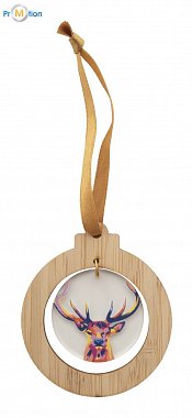 Vánoční ozdoba na zakázku z bambusové překližky a akrylu se zlatou stuhou. Cena zahrnuje plnobarevný tisk na jednu stranu akrylové části, nezahrnuje tiskovou přípravu. Min. mn.: 100 ks.