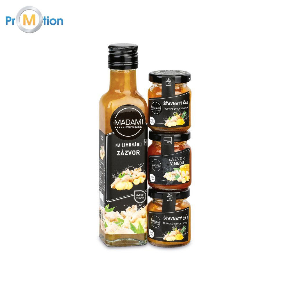 Zázvorový dárkový set, obsahuje ovocný koncentrát se zázvorem (250 ml), Zázvor v medu (68 g), pečený čaj Citrusová směs se zázvorem (2× 55 ml). 100 × 220 × 50 mm
