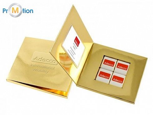 • Ražba loga na krabičku + potisk na obal čokolád. Barva krabice i stříbrná nebo zlatá
