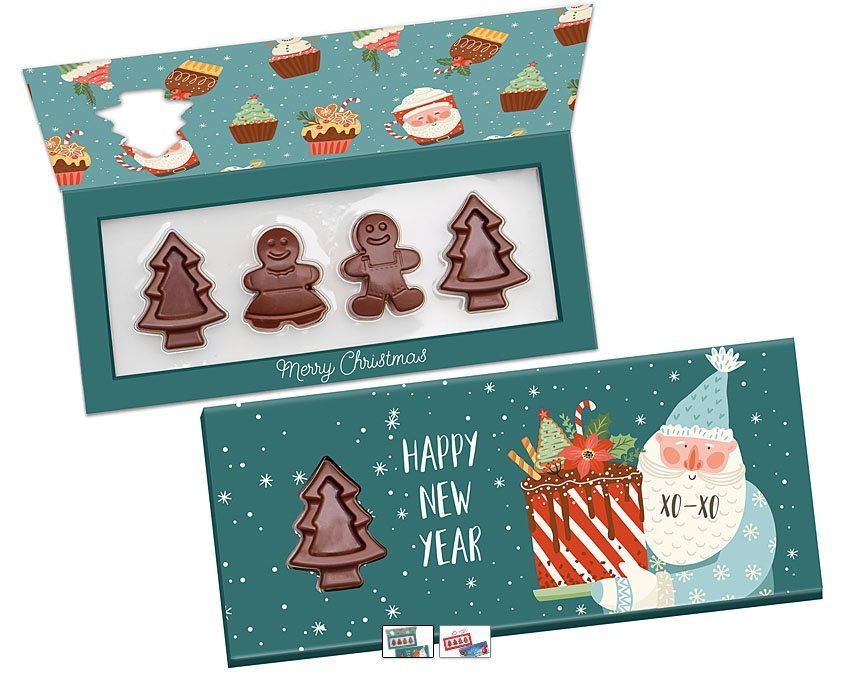Vánoční čokoládová sada 4 čokolády: dvě čokolády ve tvaru vánočního stromu, jedna ve tvaru chlapce a druhá ve tvaru dívky.