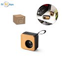 Recycled ABS and bamboo portable speaker. With 3W power, Bluetooth 5'0 transmission and radio function. Autonomy up to 4h with a 500 mAh battery. Supplied in a kraft paper gift box. 70 x 70 x 37 mm