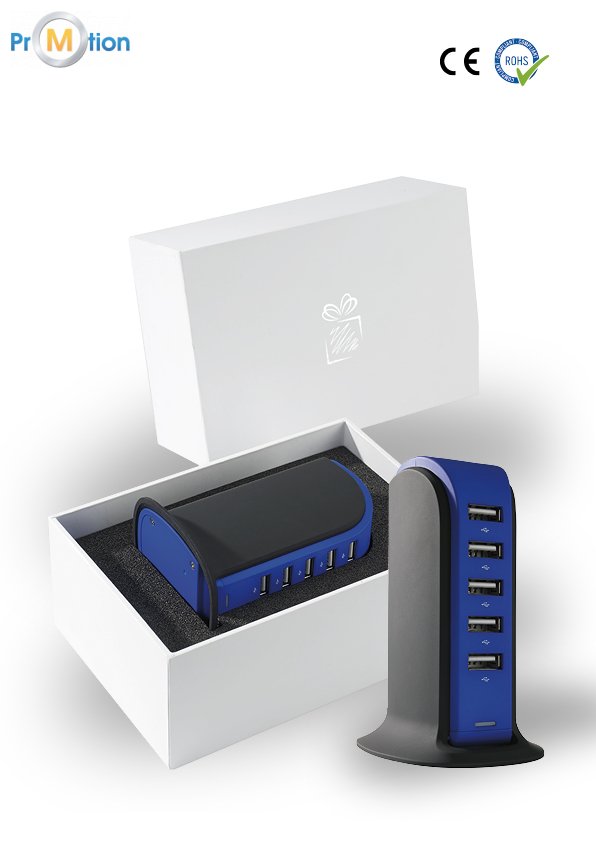 High-performance Colorissimo charging station with 5 USB ports. It is possible to charge up to 5 devices at the same time. It contains a black cable. It has dedicated ports for iPhone and iPad. Nice rubberized surface. Packed in gift wrapping. Available in these colors with the possibility of printing the logo