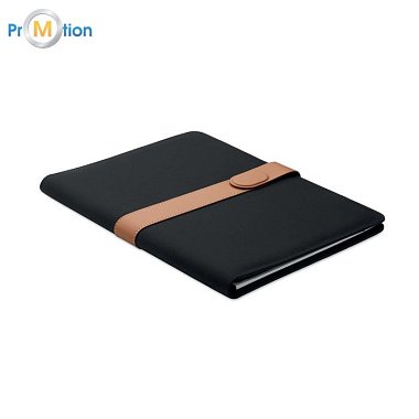 A4 portfolio in RPET with faux leather details. Replaceable A4 notepad.30 recycled paper lined pages. Pen holder. 4 cardholders, 3 small pockets and one big compartment. Magnetic strap closure.