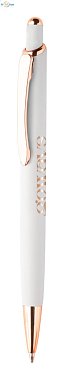 Recycled aluminum ballpoint pen with rubberized surface and rose gold details. With special surface treatment for mirror laser engraving in rose gold color. With blue filling.