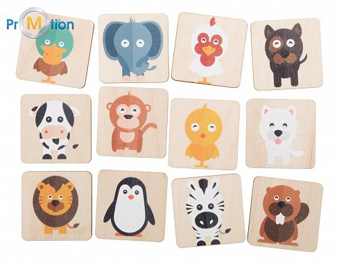 Memory game pexeso made of polamine birch wood with various motifs (professions, buildings, monuments, fruits and vegetables, vehicles, nature conservation, animals, sports). 24 motifs (40x40 mm). The price includes 1 color logo printed on the back of each motif without printing preparation. Min. qty.: 50 pcs.