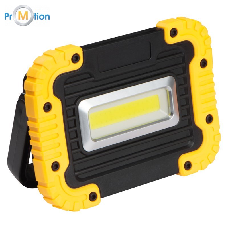 COB construction or work lamp made of plastic with 10 watts of power, 3 lighting functions (floor, SOS and flashing) and a fold-out handle for putting down or carrying.Your ad will be printed above the light.
