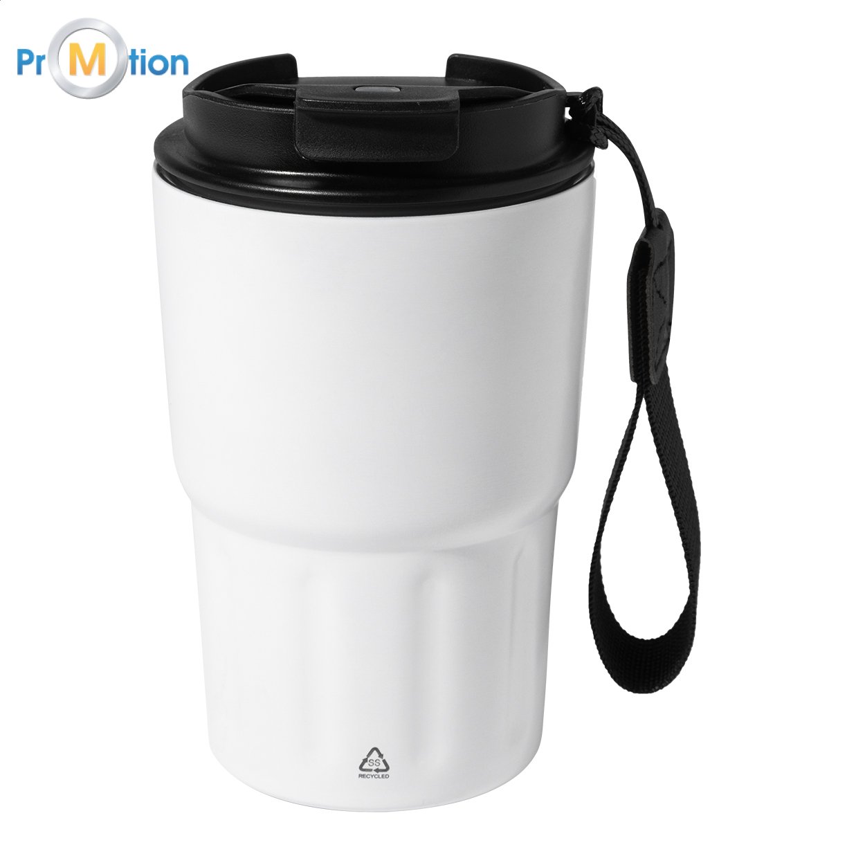 Dvojstenný termo hrnček z recyklovanej nerezovej ocele s izolačným viečkom z PP. S pútkom z RPET polyesteru. 350 ml.