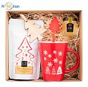 Čajová darčeková sada v kraftovej kartónovej darčekovej krabičke s výplňou z drevitej vlny a červenou stuhou. Obsahuje: vianočný hrnček "Perala"; Zimný lesný ovocný čaj "Luis" (30 g); Akátový med "Bertók" (50 g); Čajítko "Strobus"; Ozdoba na vianočný stromček "Holonda".
