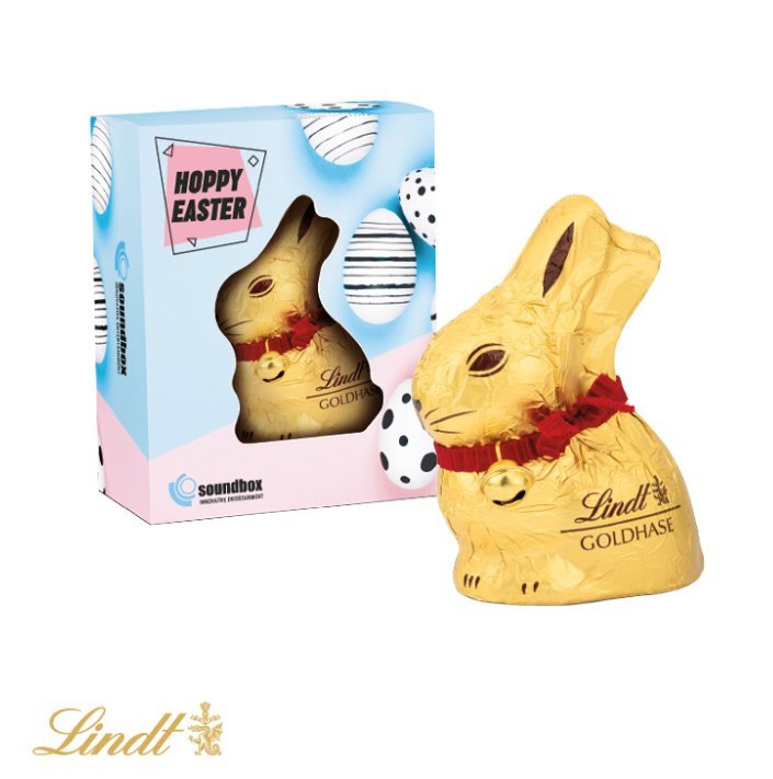 Čokoládový veľkonočný zajačik vyrobený z kvalitnej čokolády LINDT. Darčekové balenie v krabičke s vlastnou potlačou. Rozmer 74 x 94 x 40 mm