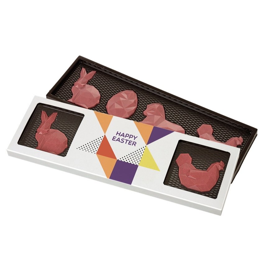 4ks čokoládových figúriek s motívom veľkej noci vyrobené z červenej, mliečnej, tmavej, alebo bielej čokolády. Balené do krabičky s okienkom, na krabičku sa tlačí vlastný motív po celej ploche