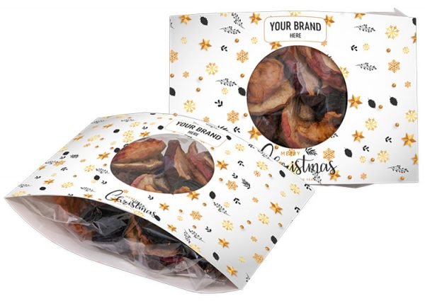 vianočné sušené ovocie ( hruška, slivky, marhule, hrozienka) balené v priehľadnom obale a papierovom darčekovom prebale s vlastnou tlačou po celej ploche.